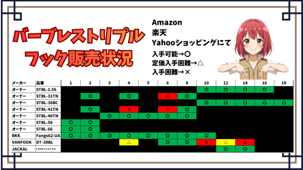 2026年3月時点で大手ECサイトで購入できるバーブレスフックの一覧表はこちらです。