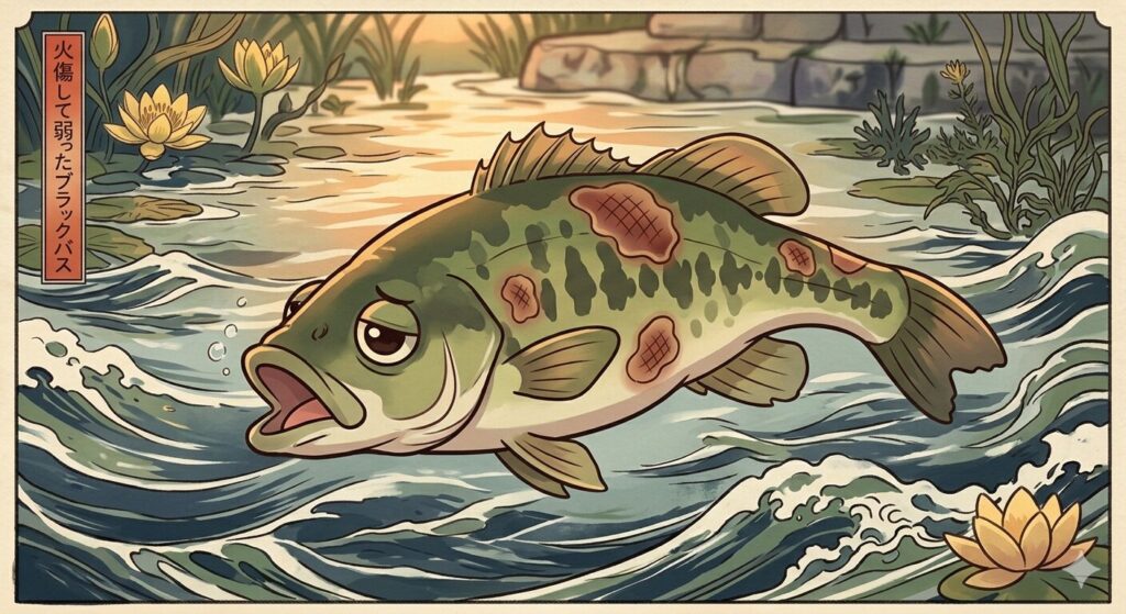 地面に付けられてヤケドを負う&粘膜というバリアを失ったブラックバスは地面にいる雑菌や微生物の侵入を簡単に許してしまいます。