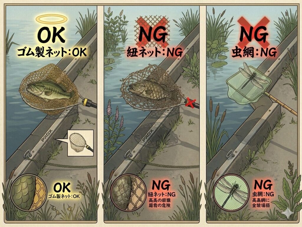 心配な人は釣具屋さんへ行って「バスの管理釣り場に行くんですが、ゴム製のランディングネットでなるべく安いヤツあります?」って聞けばいいと思います。3,000円~5,000円くらいのヤツを紹介してくれると思います。