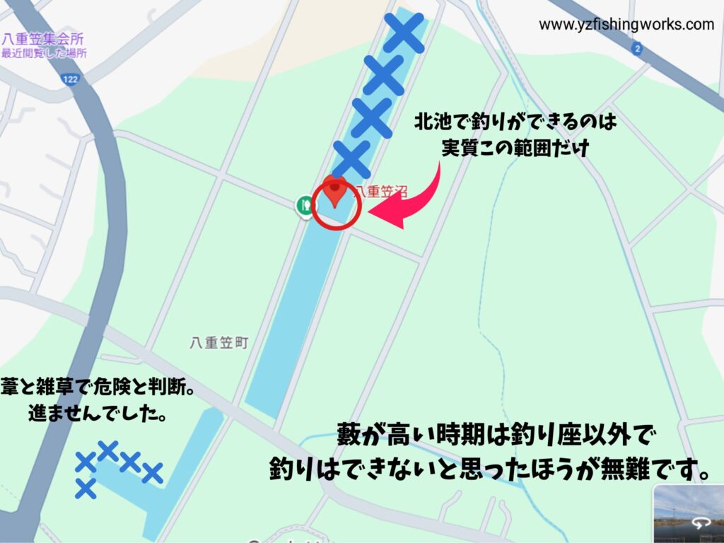 特に北池に関しては事務所付近の釣り座(3か所)以外にエントリーできる場所がなく、実質的にほとんど釣りができる場所がありません。